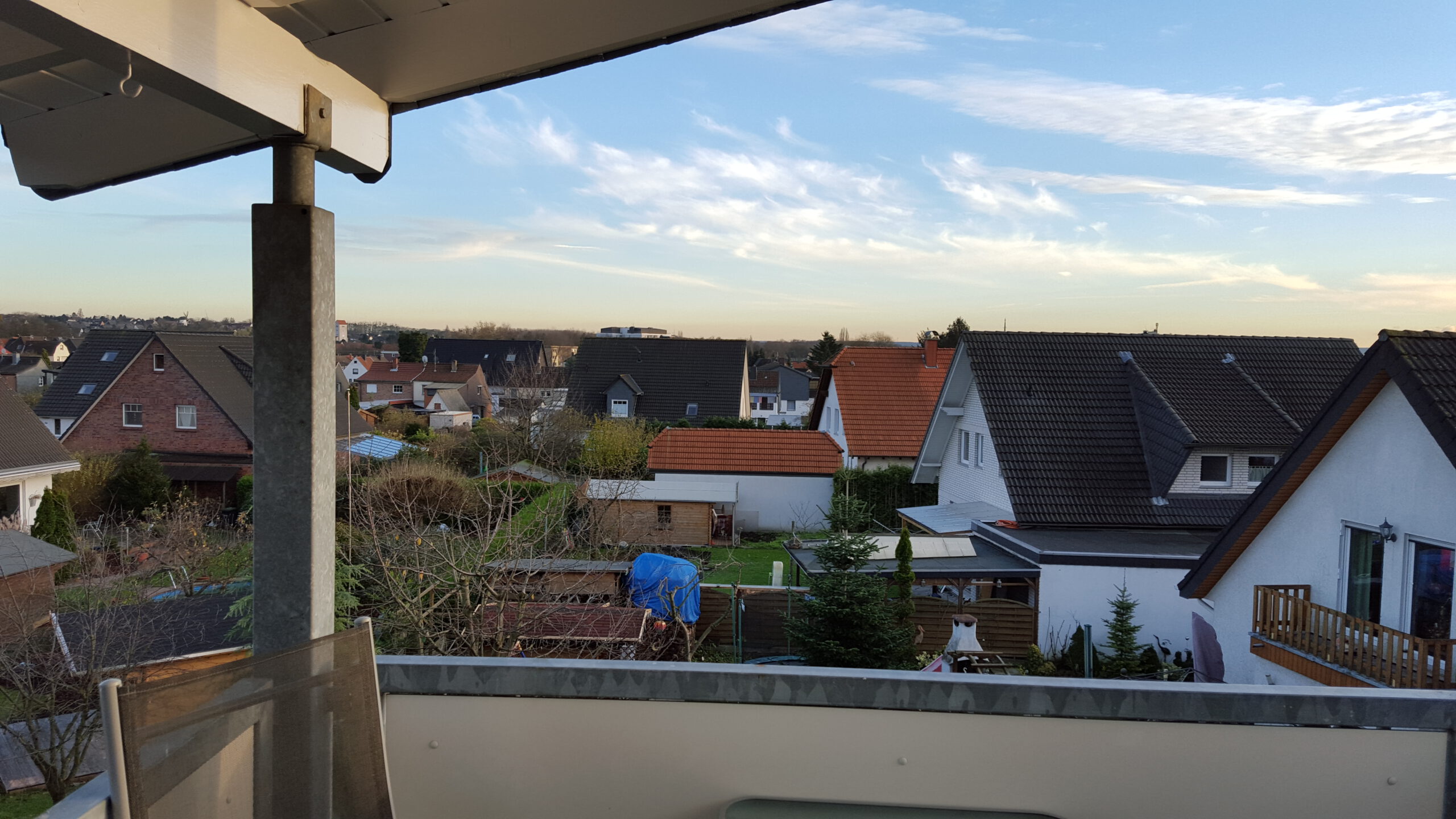 Ein 5,8 qm großer, überdachter Balkon mit Bangkirai Holz und einem schönen Fernblick runden das Bild ab.
