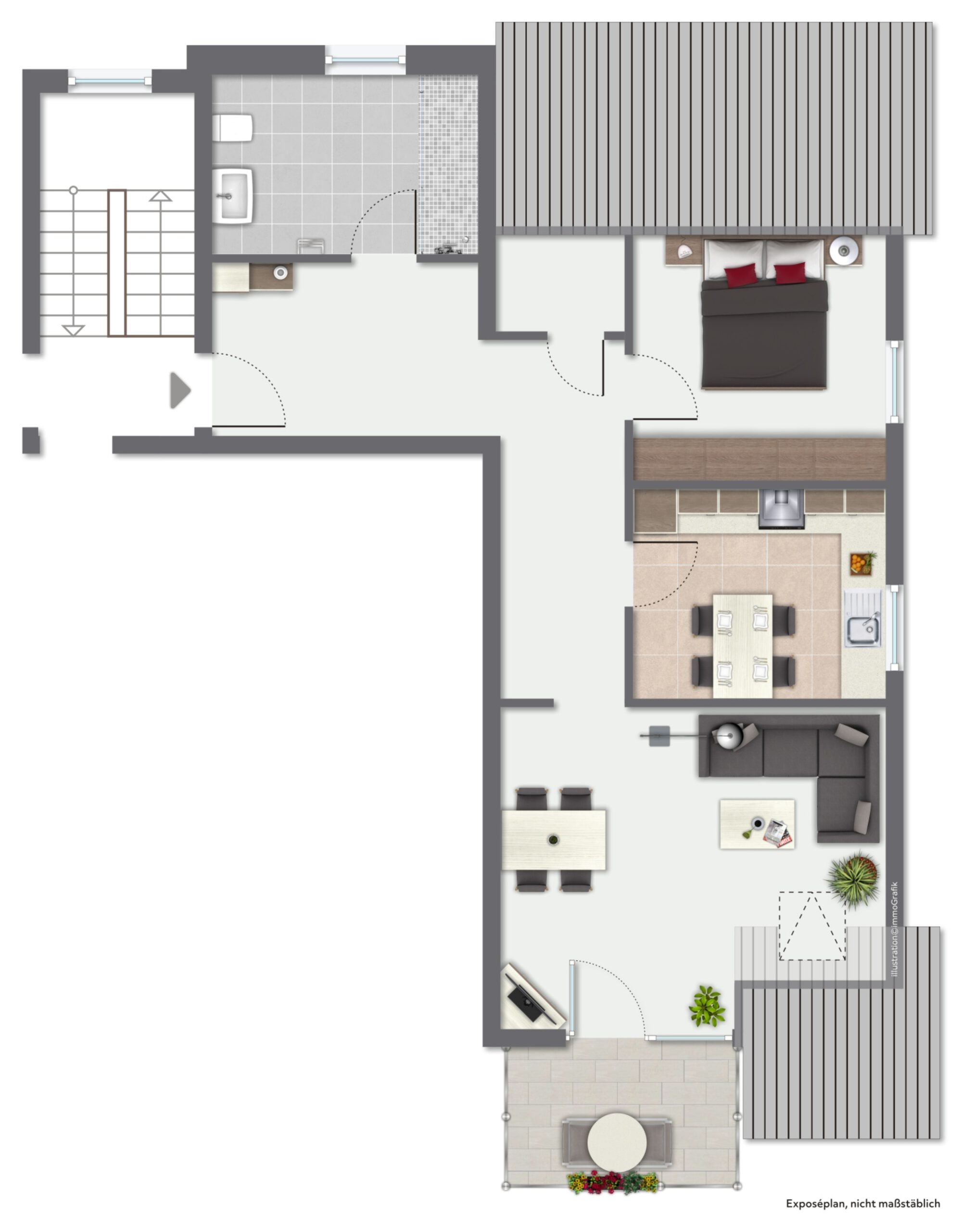 Die Wohnung ist im Dachgeschoss links. Sie hat eine Wohnfläche von 70,28 qm. Sie ist hell und lichtdurchflutet. Der Grundriss ist modern und offen gestaltet. Die bodentiefen Fenster öffnen die Räume.